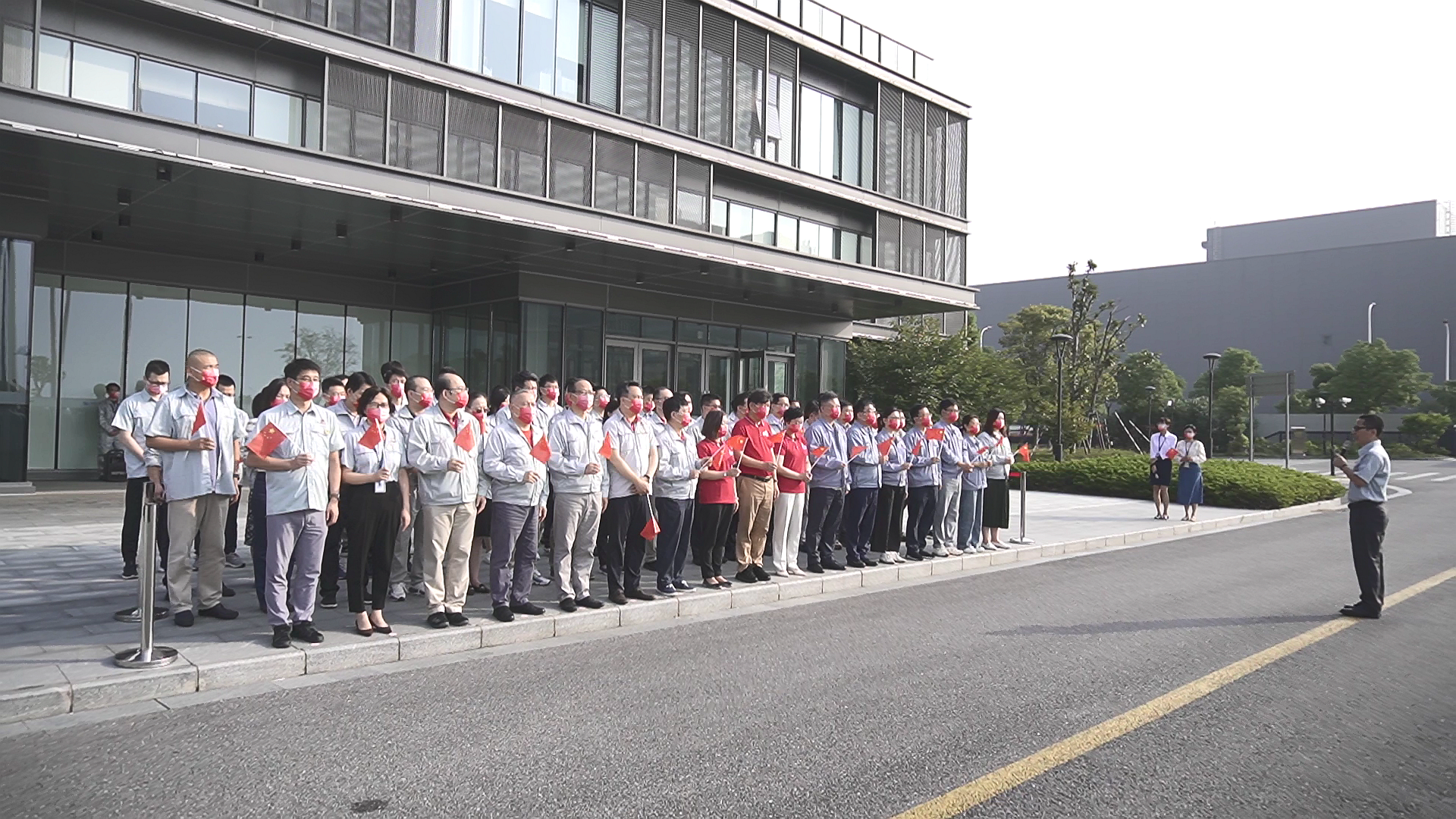 早上8:00,升國(guó)旗儀式正式開(kāi)始,全體人員同唱《中華人民共和國(guó)國(guó)歌》,向國(guó)旗行注目禮,莊嚴(yán)肅穆的國(guó)歌聲回蕩在華虹六廠,鮮艷的五星紅旗在嘹亮的國(guó)歌聲中冉冉升起,愛(ài)國(guó)之情在心中激蕩。